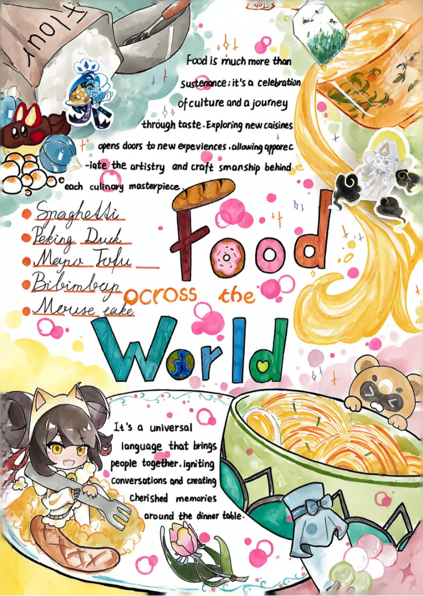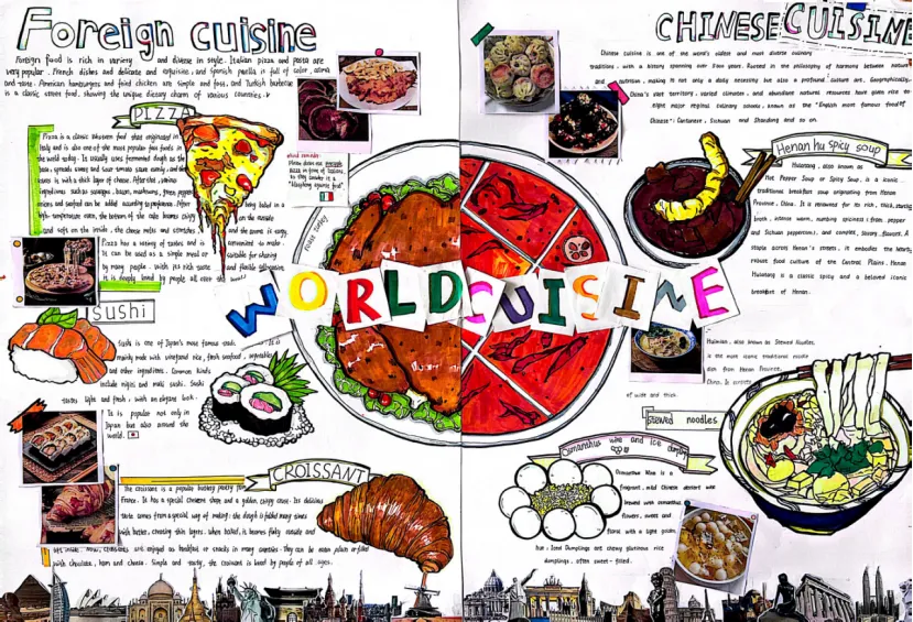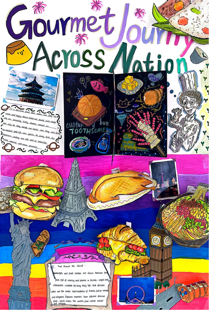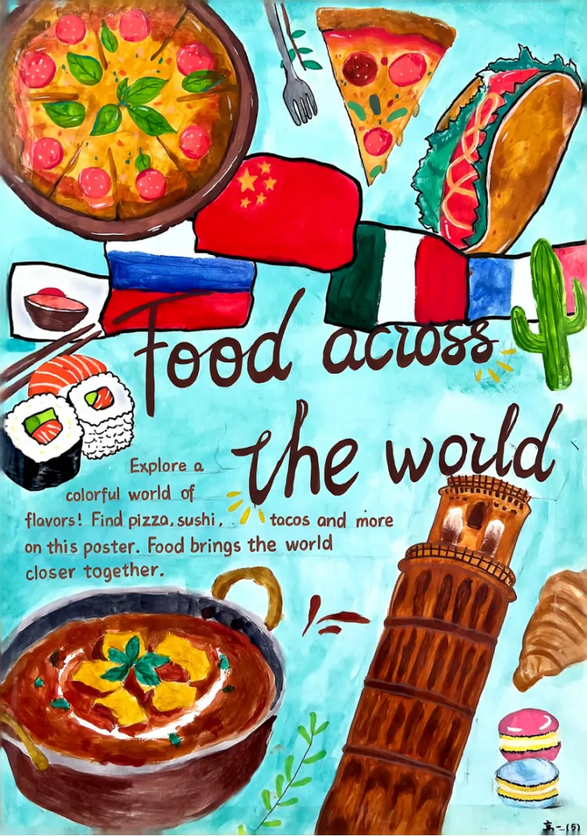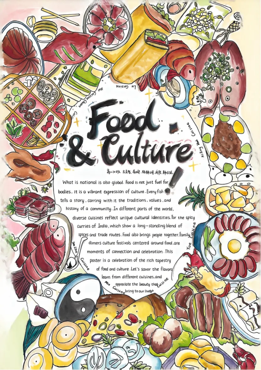 一方风土,滋养一方食事;一段文明,凝于一味佳肴。作为外语文化节的启幕活动,海报展率先携香而至。全校以班级为单位,开展“世界美食文化”主题海报创作活动。从东方温润的清鲜醇和,到西域热烈的浓郁奔放,从东南亚的热带果香,到欧陆的精致典雅,万千风味跨越山海,汇聚于少年笔下。同学们精心勾勒、用心创作,用色彩与线条呈现心中的世界滋味,让每一款美食都成为文化的载体,每一幅作品都饱含对生活的热爱。作品既展现了同学们灵动的创意与扎实的实践能力,也让大家在品味美食、描绘美食的过程中,读懂不同地域的历史风情与人文底蕴,进一步点燃了对世界多元文化的探索热情,让舌尖上的文明在校园里熠熠生辉。
