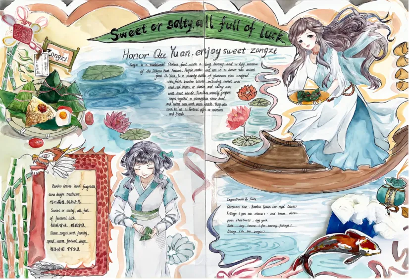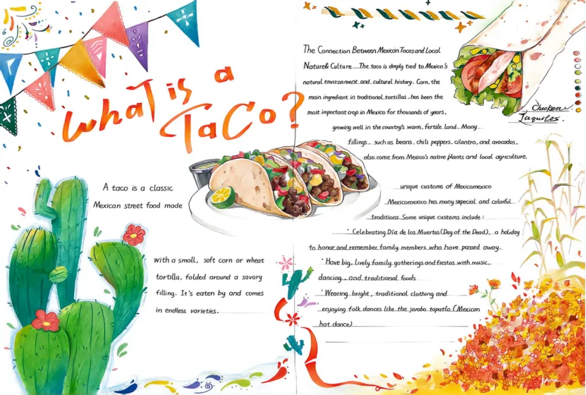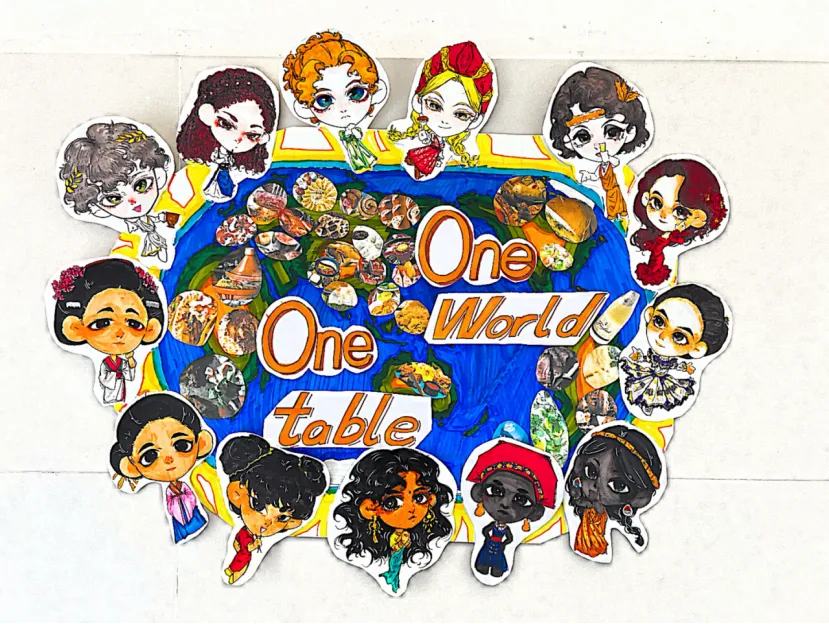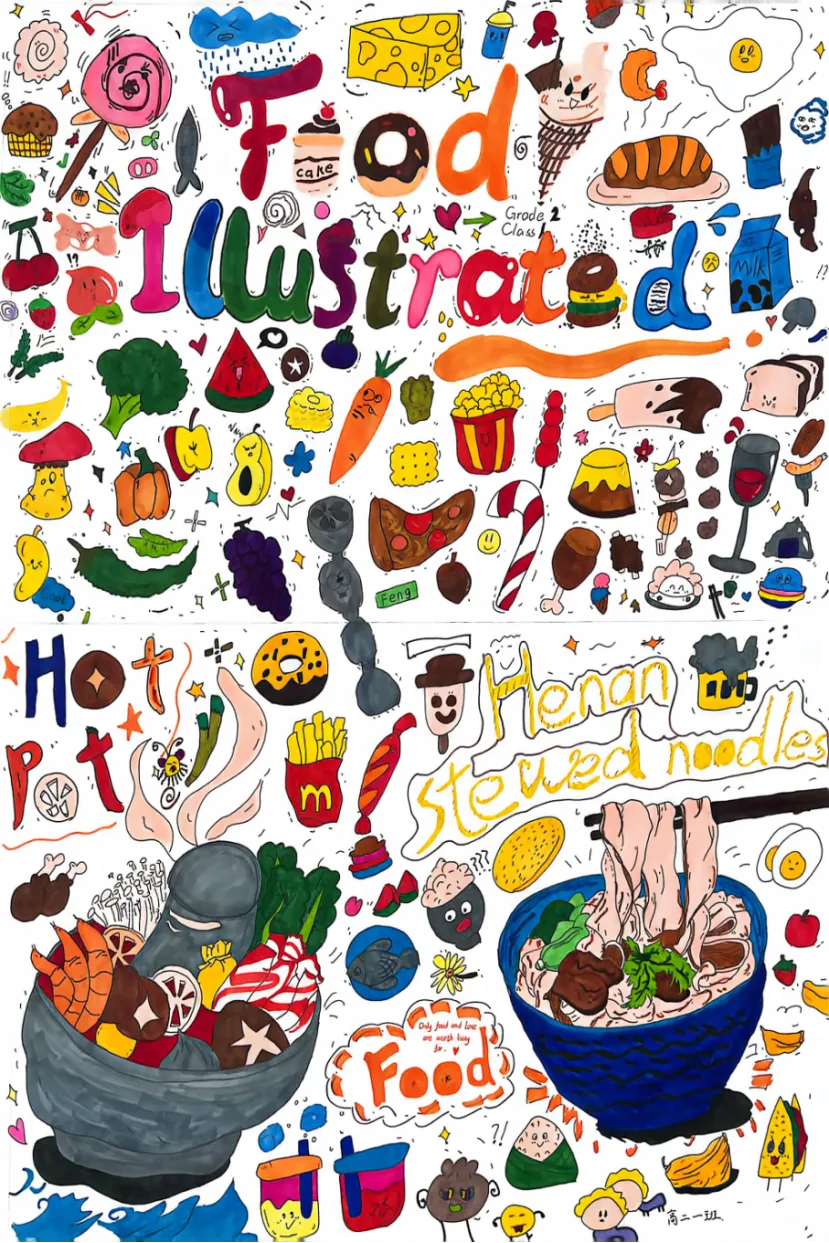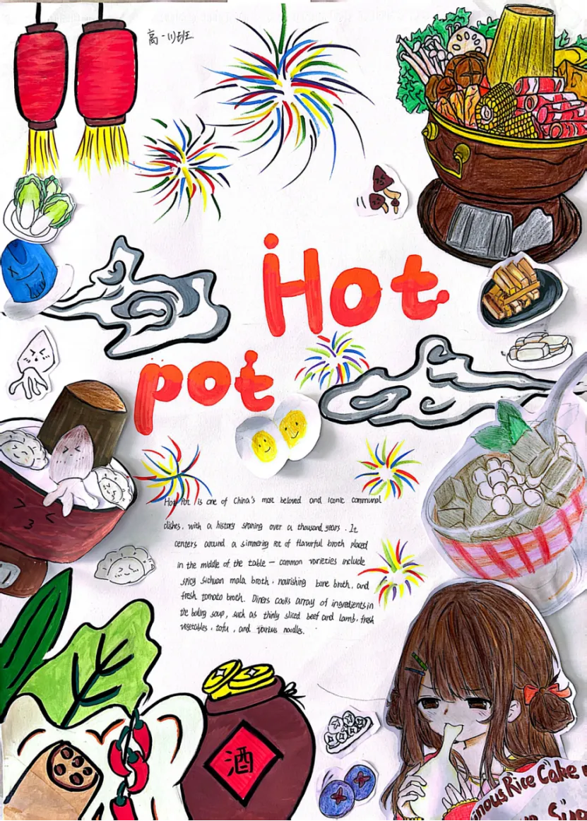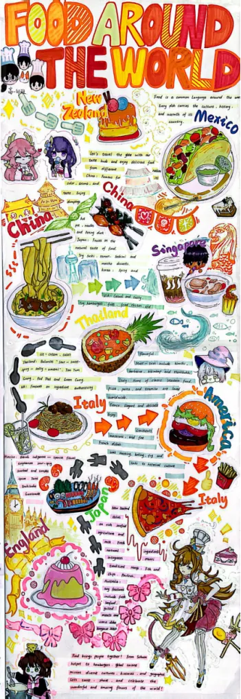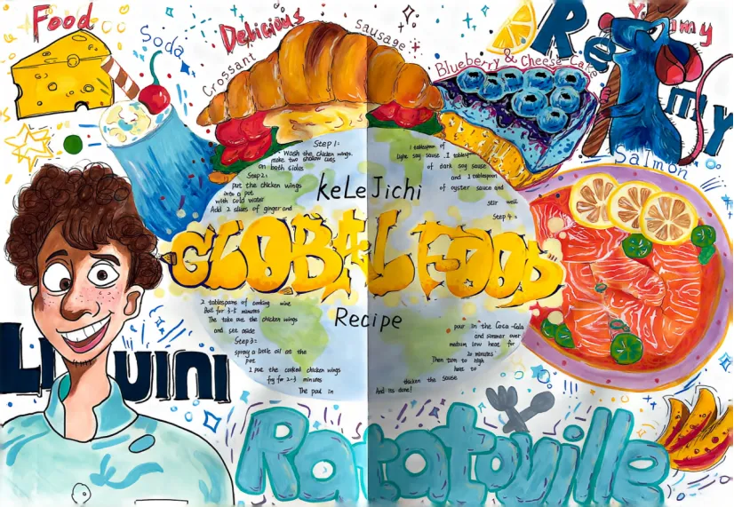 一方风土,滋养一方食事;一段文明,凝于一味佳肴。作为外语文化节的启幕活动,海报展率先携香而至。全校以班级为单位,开展“世界美食文化”主题海报创作活动。从东方温润的清鲜醇和,到西域热烈的浓郁奔放,从东南亚的热带果香,到欧陆的精致典雅,万千风味跨越山海,汇聚于少年笔下。同学们精心勾勒、用心创作,用色彩与线条呈现心中的世界滋味,让每一款美食都成为文化的载体,每一幅作品都饱含对生活的热爱。作品既展现了同学们灵动的创意与扎实的实践能力,也让大家在品味美食、描绘美食的过程中,读懂不同地域的历史风情与人文底蕴,进一步点燃了对世界多元文化的探索热情,让舌尖上的文明在校园里熠熠生辉。