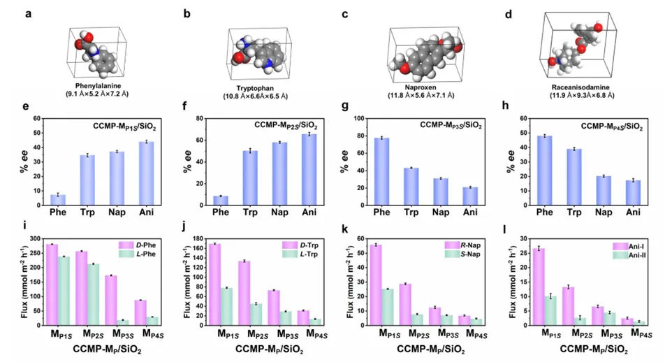 图2.手性外消旋体的分子尺寸:(a)苯丙氨酸,(b)色氨酸,(c)萘普生,(d)山莨菪碱。复合膜的对映选择性(% ee):(e) CCMP-MP1S/SiO2,(f) CCMP-MP2S/SiO2,(g) CCMP-MP3S/SiO2,(h) CCMP-MP4S/SiO2。手性分离的渗透通量值:(i)苯丙氨酸,(j)色氨酸,(k)萘普生,(l)山莨菪碱。该工作以“Cascade-controlled porous composite membranes: pore-supporting synergy enabling high-flux enantioseparation of amino acids and pharmaceuticals”为题,发表在Science China Materials。齐齐哈尔大学藏雨为论文第一作者,藏雨、张伟为共同通讯作者,文章将收录于手性材料专题中(SPECIAL TOPIC: Chiral Materials)。