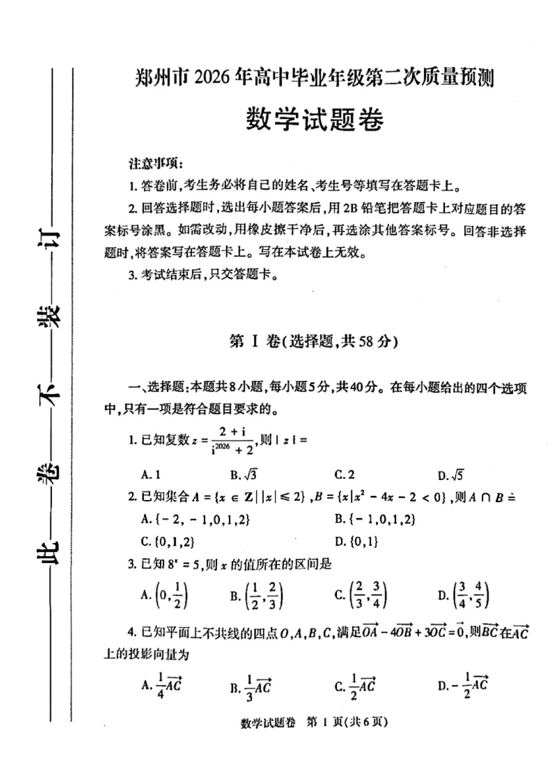 >郑州市2026届高三第二次质量预测数学试题及答案解析