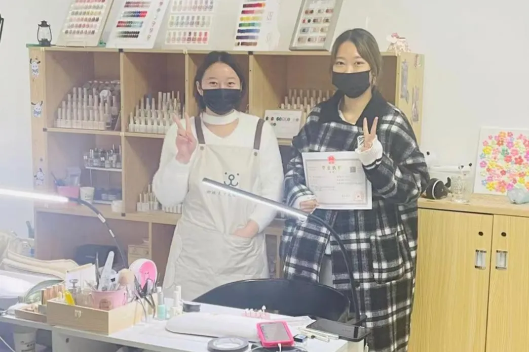 2019级形象设计4班唐晓清、刘荣, 毕业后在湖北省武汉市夏江区自主创业,开设一家特色美甲店,主要经营美甲造型、手部护理、潮流概念美甲等,并定期招收美甲学员开展培训。