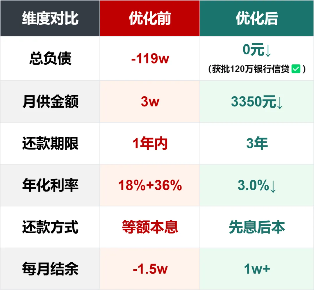 *通过我们提供的财务优化方案,张先生已结清全部网贷,并成功获批120万银行低息贷款。原先3万多的月供现已降至3千余元,以他1万5左右的月薪来看,这笔还款压力已完全可控。(实际额度以客户真实情况与银行最终审批为准)