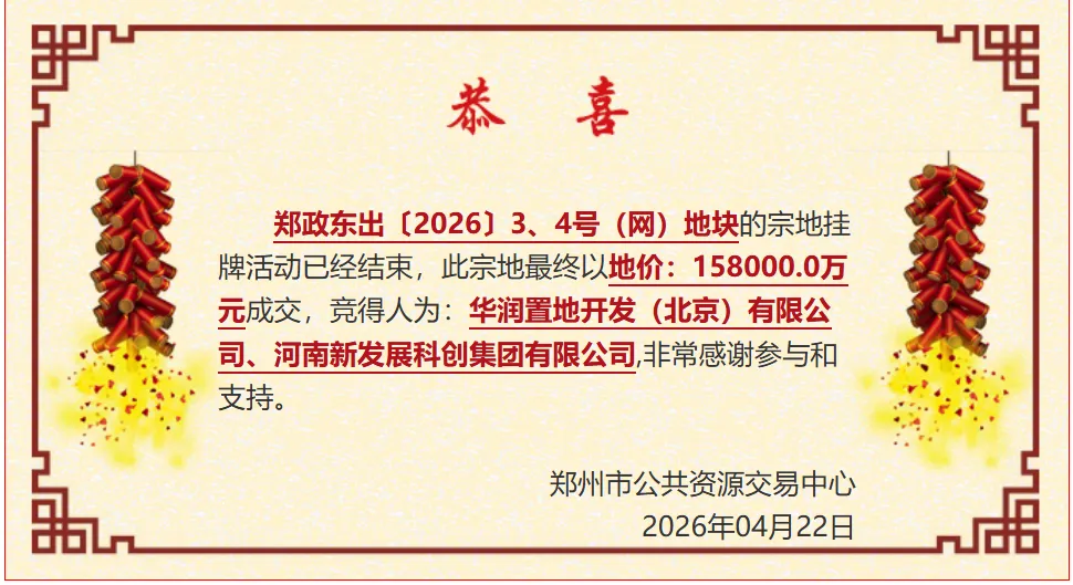 4月22日,郑州市2026年首宗住宅用地正式挂牌出让。其中,郑政东出〔2026〕3号(网)、4号(网)两宗地块以起始价15.8亿元,被华润置地开发(北京)有限公司与河南新发展科创集团有限公司联合竞得,标志着郑州今年土地市场正式启幕。