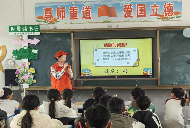 活动现场,教室被精心布置,墙面悬挂着“书香换蔬香,童心共成长”主题横幅和孩子们的画作,充满温馨的学习气息。志愿者们首先组织了读书日猜谜活动,孩子们积极举手抢答,在轻松的氛围中感受文字的魅力。随后,志愿者以生动的语言开展世界读书日宣讲,讲述阅读的重要性,激发孩子们的阅读兴趣。