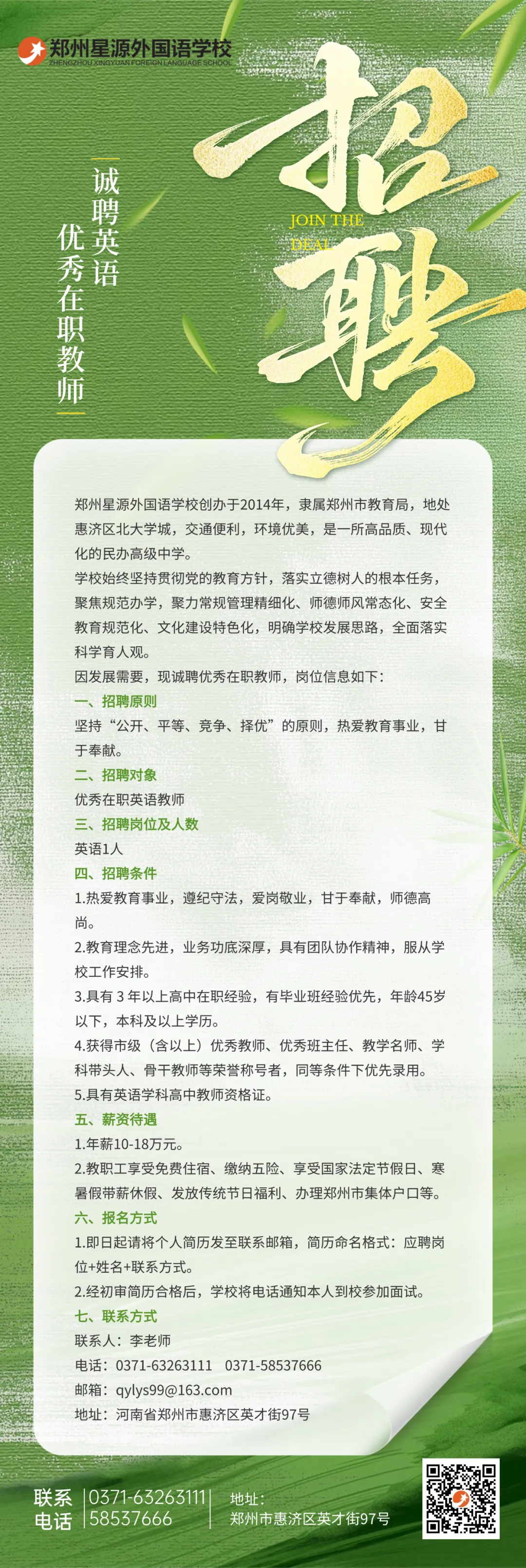 >郑州星源外国语学校诚聘英语优秀在职教师
