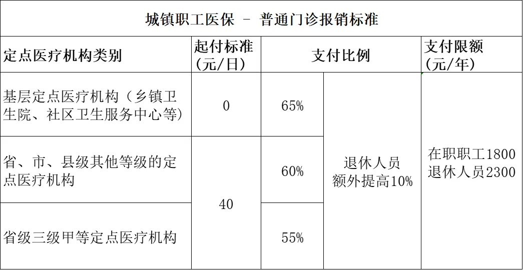 在一个自然年度内,参保人员在定点医疗机构门诊就医,起付标准按次设定,每次40元,一天内在同一家定点医疗机构多次就诊只负担一次起付线标准。乡镇卫生院、社区卫生服务中心则不设起付线标准。同一年度内,在职职工最高支付限额为1800元,退休人员2300元。
