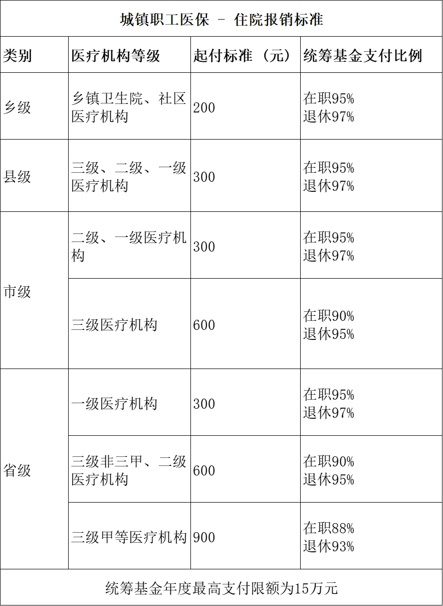 在市级(三级)、省级(二级、三级非甲等)定点医院住院的,起付标准为600元,报销比例为95%;