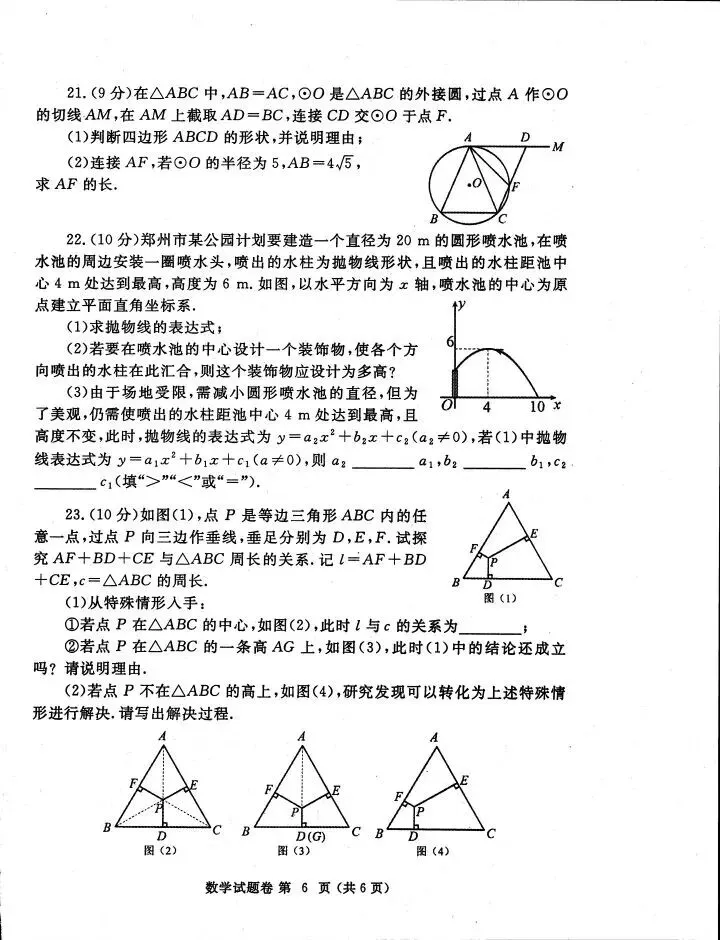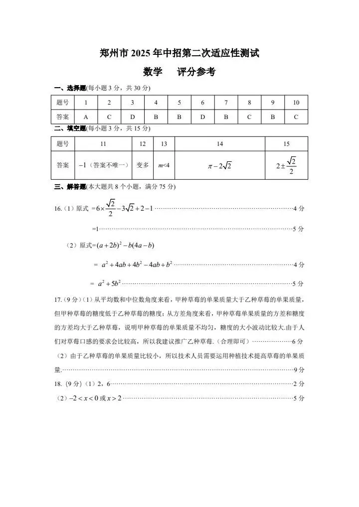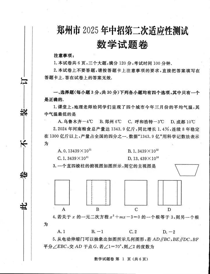>郑州2025二模考试数学卷及答案