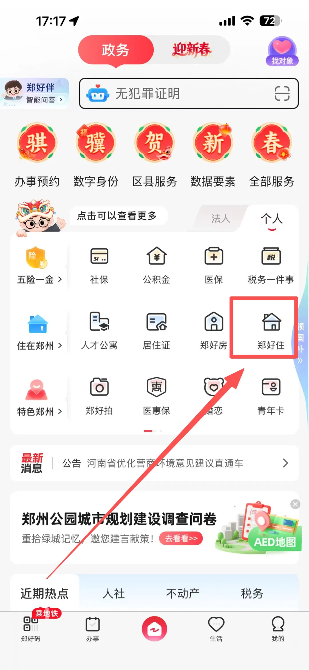 进入郑好办后选择【郑好住】,再点击【公租房】,选择【我要申请公租房】即可进入申请
