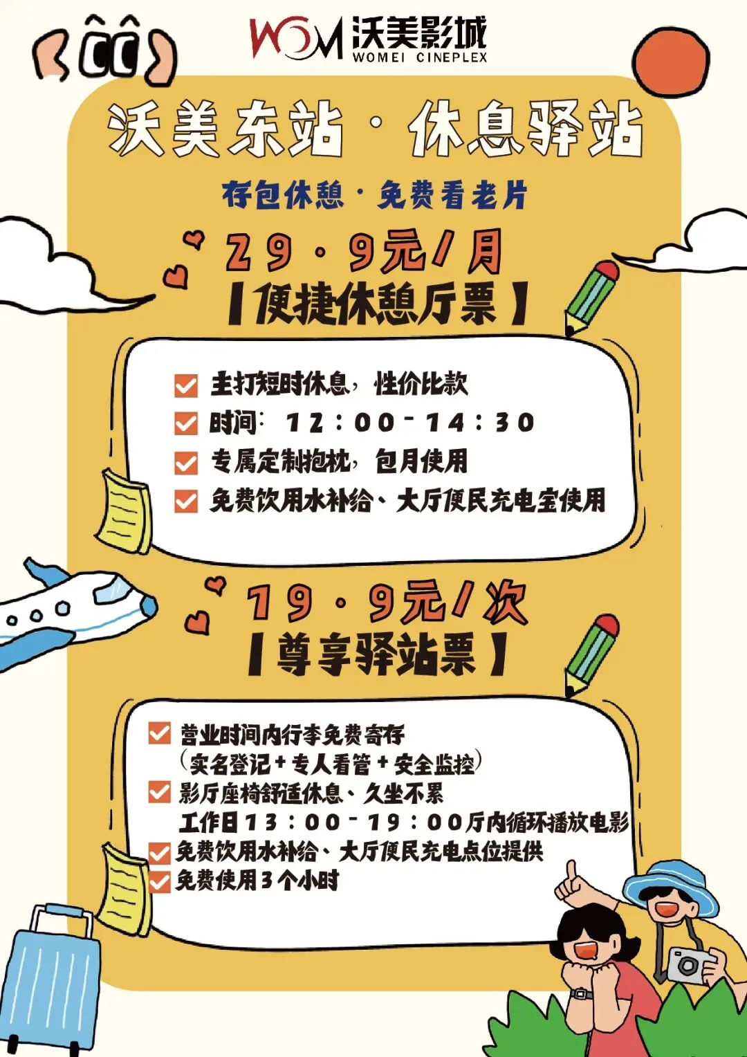 - 尊享驿站票工作日13:00-19:00循环播放老片,周末也可使用影厅休息哦