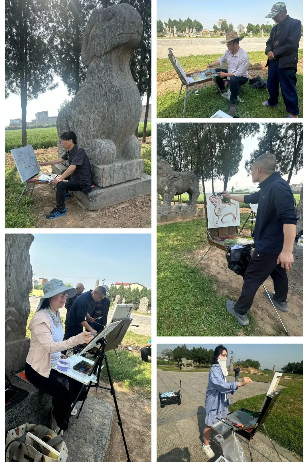 老师们驻足永熙陵核心写生点位,选取最佳取景角度支起画架,专注捕捉神道石像的苍劲肌理、林木光影的层次变化、春日天光与古建古迹的意境交融。大家以油画笔触描摹大宋陵寝千年风骨,在一笔一画间解读中原宋韵文化底蕴,将历史沉淀的宋式美学与春日自然灵秀,尽数定格在画布之上。