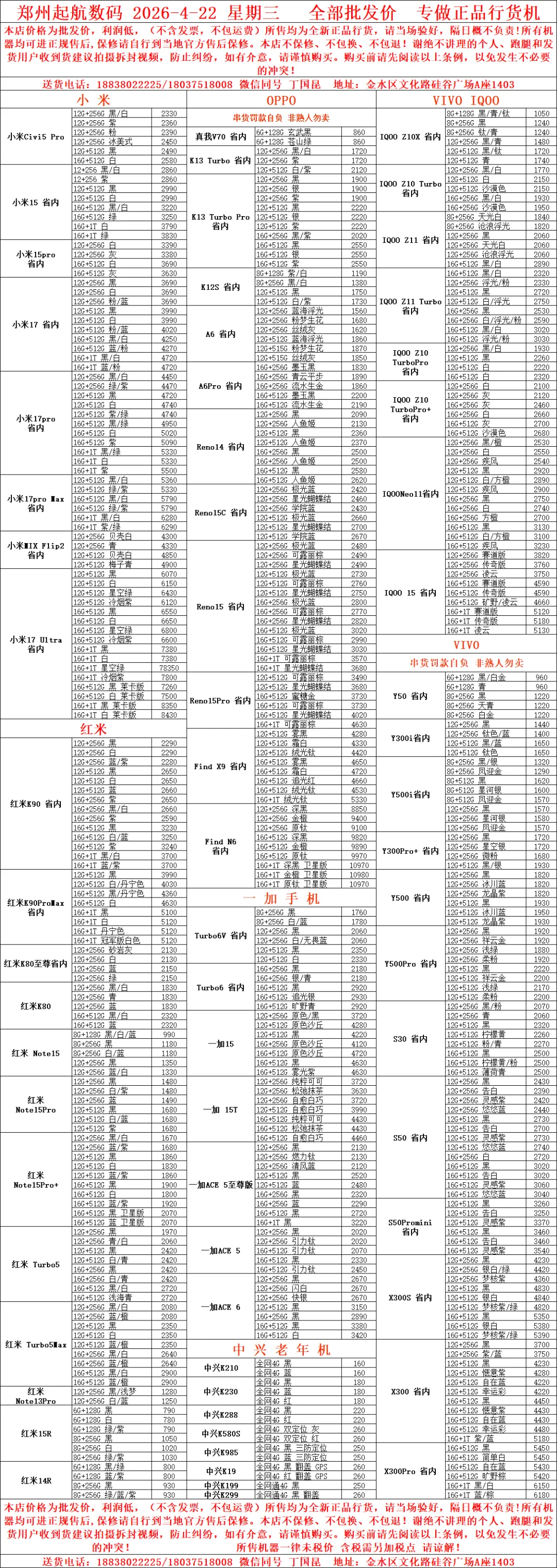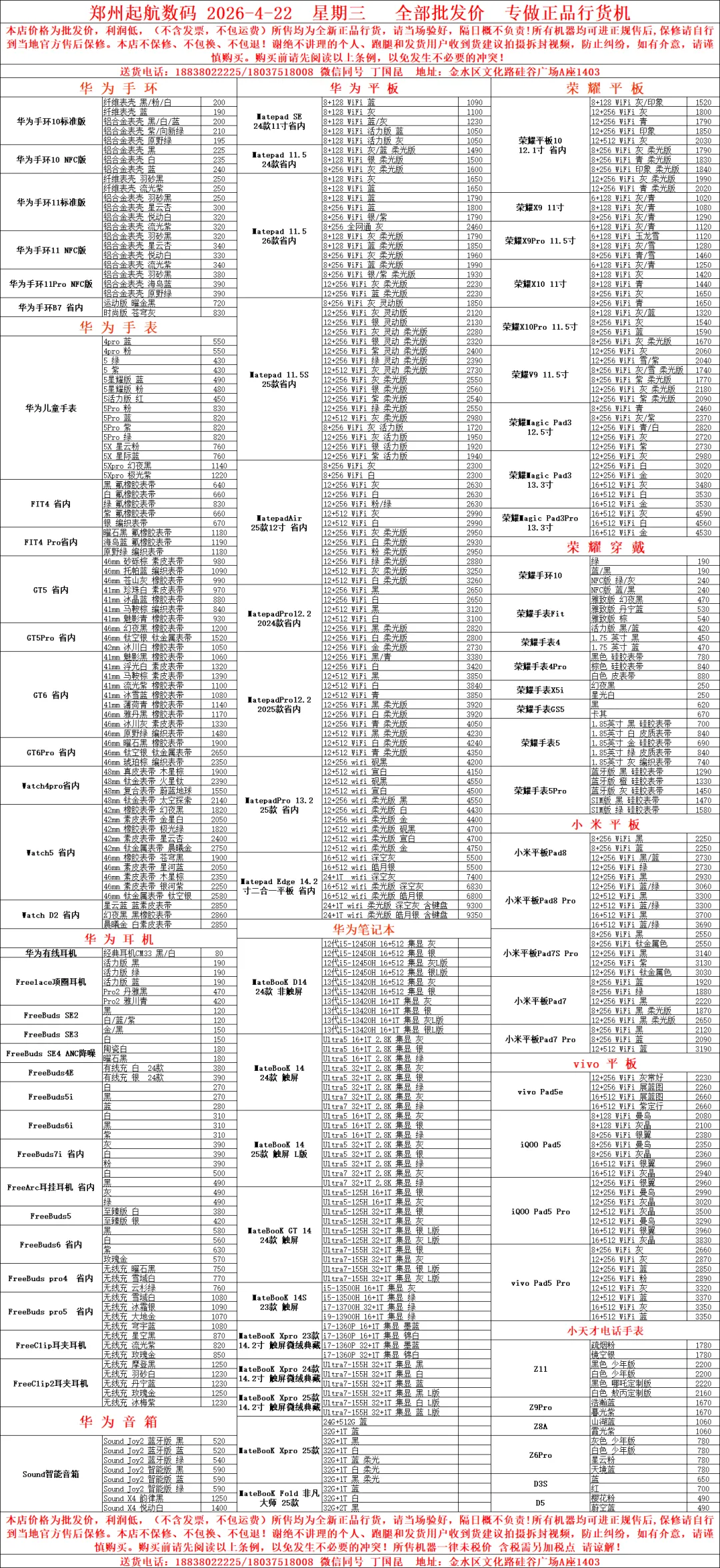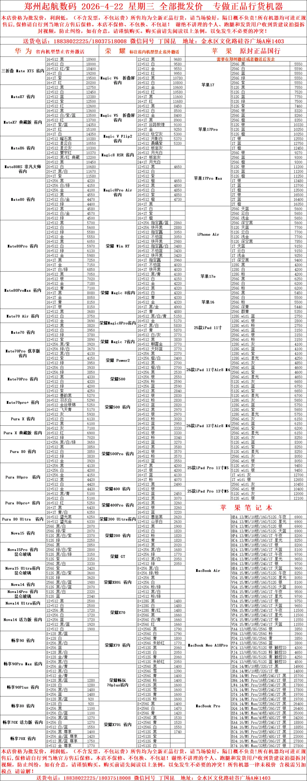 每天手机最新行情 请关注微信每日推送微信公众号:郑州起航数码公司地址:郑州市金水区文化路82号硅谷广场A座1403