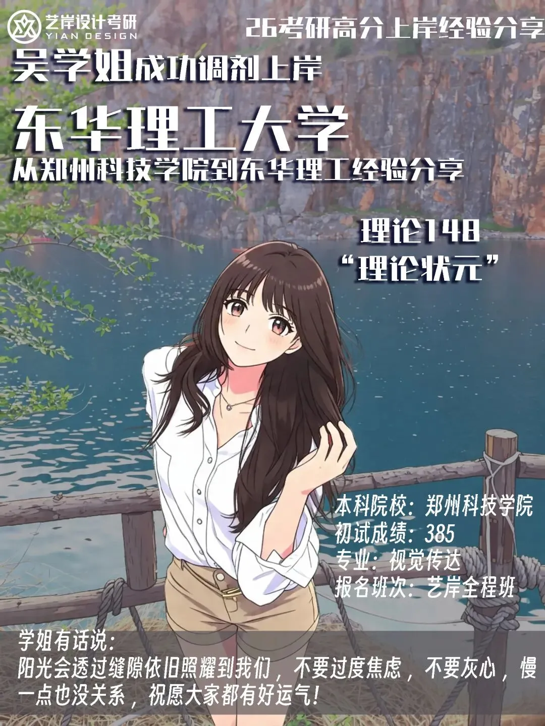 在艺岸老师们的专业指导下,我以 385 分的成绩拿到了两所院校的复试通知。其中一所院校临时从线上改为线下复试,我毫无笔试准备,十分慌张。艺岸老师不断鼓励我、帮我梳理思路、调整心态,让我能够轻装上阵、全力冲刺。