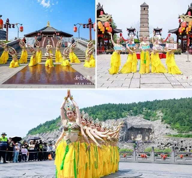 场景破圈:敦煌飞天“快闪”河南地标,千年文明有了新表情活动最亮眼的一笔,是把舞台从会议室搬到了景区里、商圈中、人潮间。4月18日至19日,甘肃文旅带着敦煌舞蹈等专业演艺团队,走进龙门石窟、龙门古街、洛邑古城、明堂等河南顶流网红打卡地,进行快闪拍摄。丝路飞天的飘飘衣袂,与中原古迹的石窟佛像、唐风建筑同框——两种文明的碰撞,被镜头一帧帧记录下来,迅速成为社交平台上的刷屏素材。4月20日晚,快闪热度继续升温。在亳都·新象文旅街区,商圈快闪表演、文创市集展示、非遗技艺互动轮番登场,甘肃文旅以年轻人最熟悉的“潮流化、近距离、可参与”的方式,揉进了“你刚好路过,我刚好在演”的城市烟火气里。