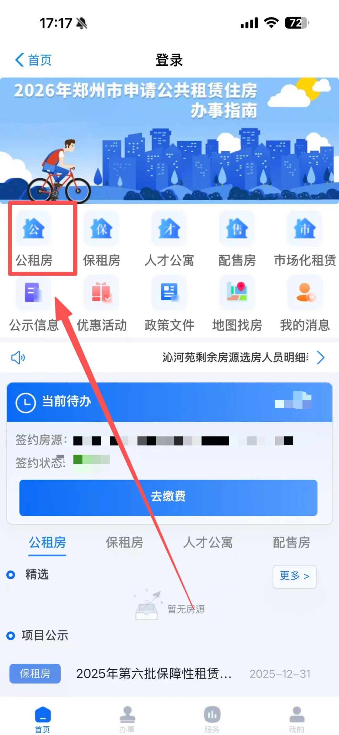 进入郑好办后选择【郑好住】,再点击【公租房】,选择【我要申请公租房】即可进入申请