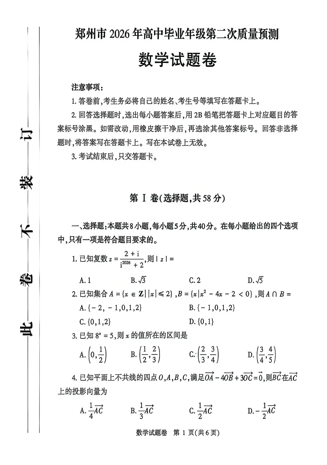 >郑州二模|郑州市 2026 年高中毕业年级第二次质量预测