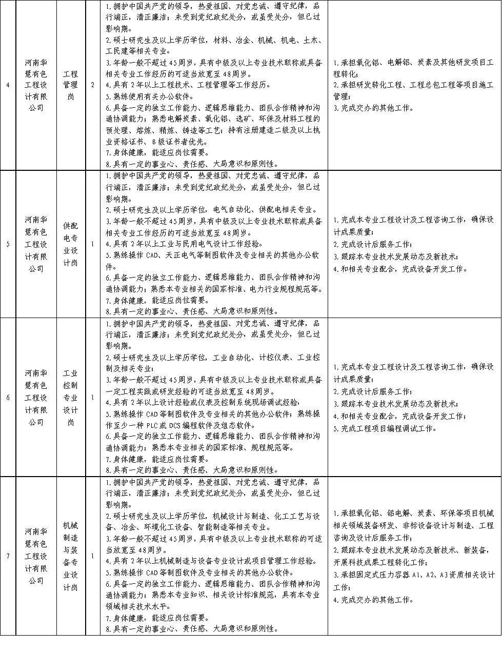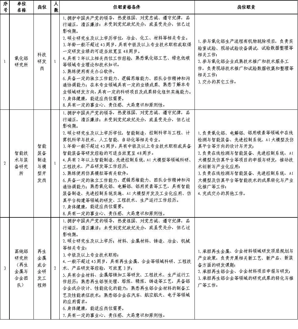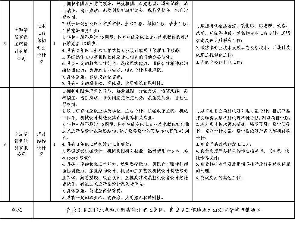 招聘岗位包括:氧化铝科技研发岗1人,智能装备制造与模型开发岗1人,再生金属或合金研发工程师2人,河南华慧工程管理岗2人,河南华慧供配电专业设计岗1人,河南华慧工业控制专业设计岗1人,河南华慧机械制造与装备专业设计岗1人,河南华慧土木工程结构专业设计岗1人,宁波烯铝产品结构设计岗1人,岗位详细信息见下图: