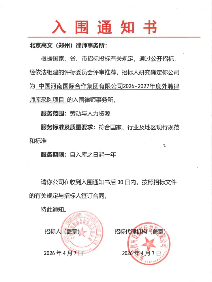 日前,经过评标委员会的严格评审与推荐,高文郑州办公室成功入围中国河南国际合作集团有限公司2026-2027年度外聘律师库下的劳动与人力资源子库。此次入围充分体现了高文郑州办公室在劳动与人力资源领域的专业实力与服务能力。