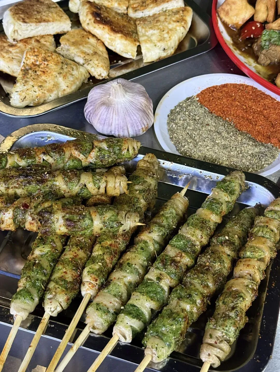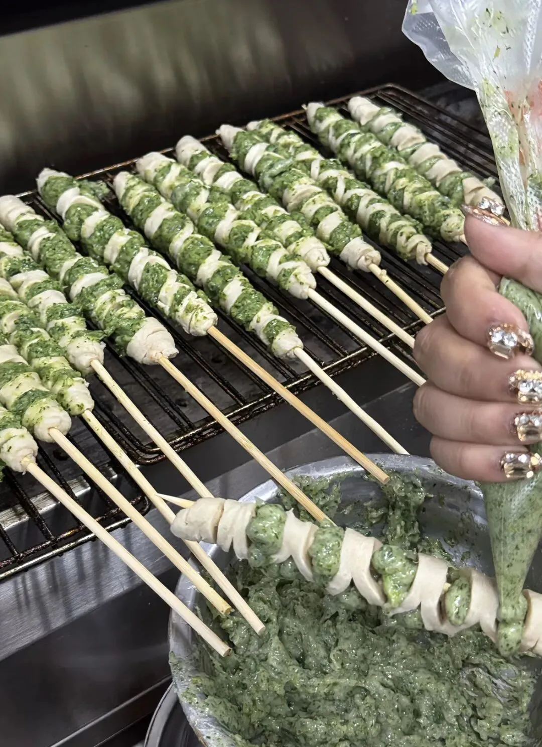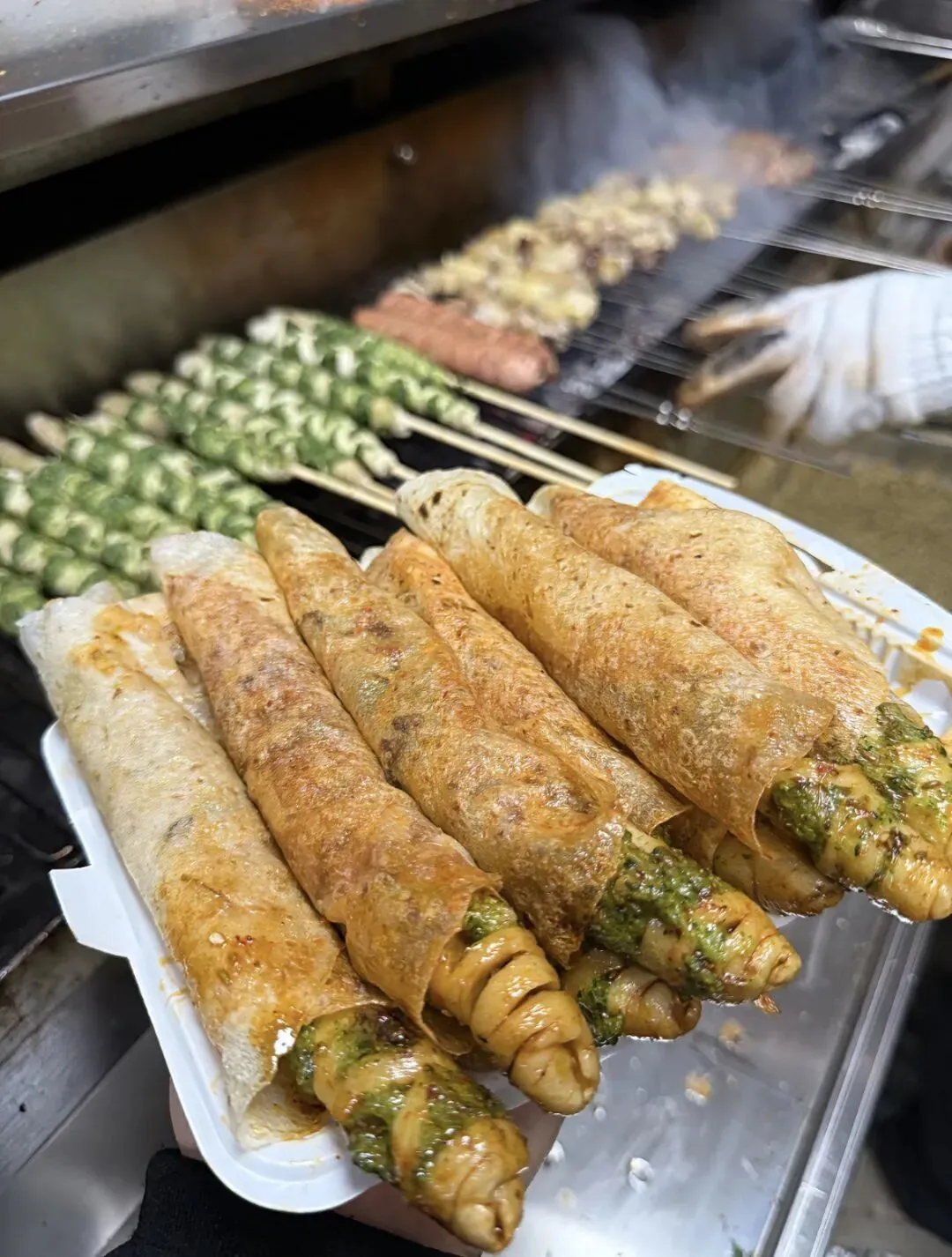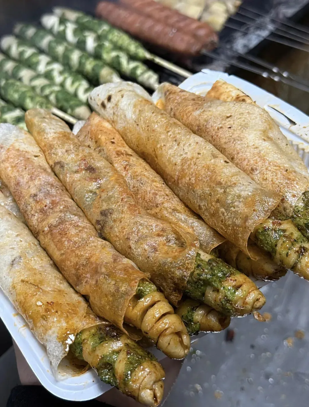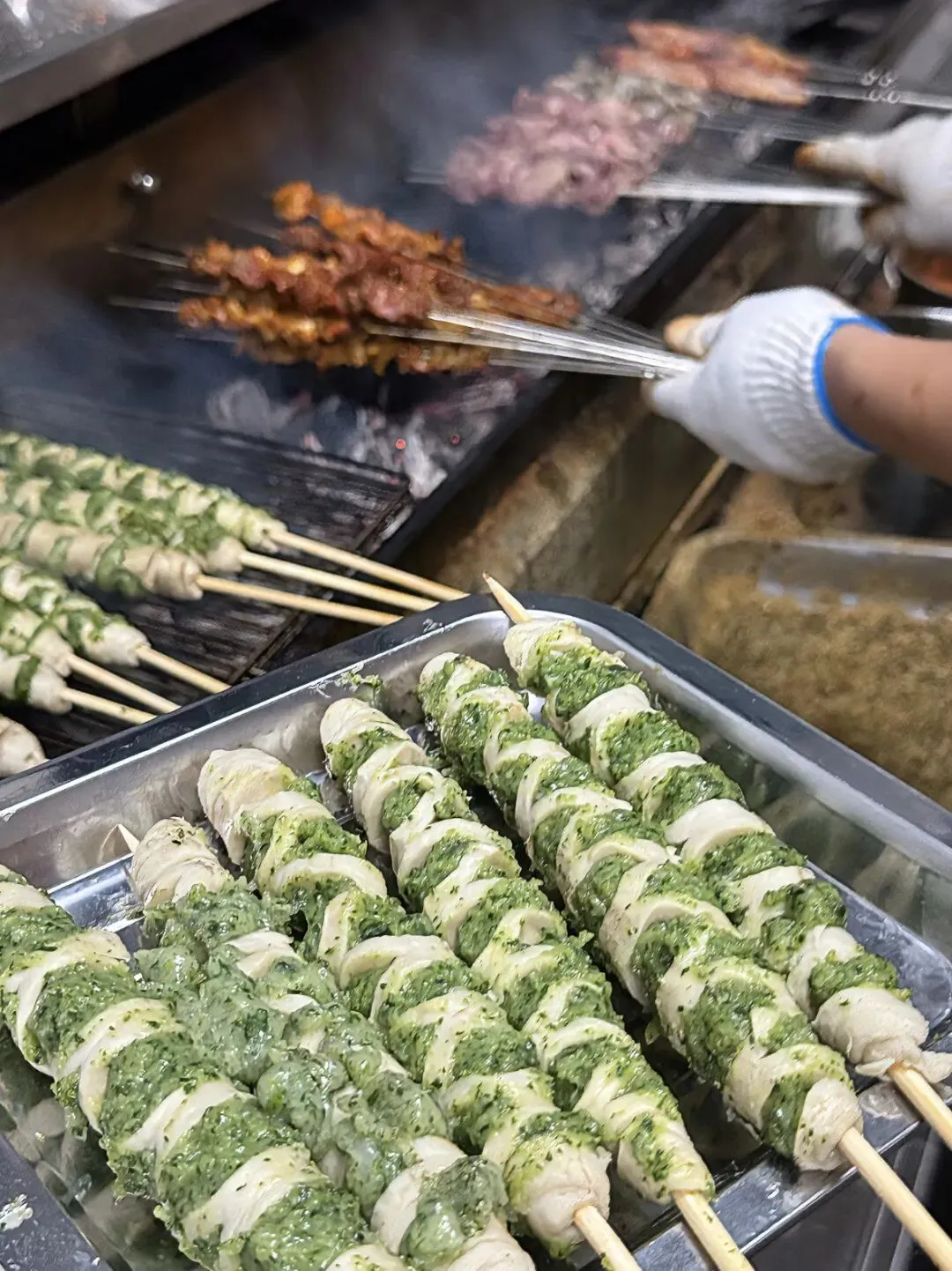 虾滑,菠菜,面筋,洛馍,烧烤,这几样东西能结合在一起,你敢想?第一次吃这个就被惊艳到了,那味道简直了,Q弹,还带着孜然香味,加上面筋,卷在洛馍里,那味道,真的只有尝过才知道。