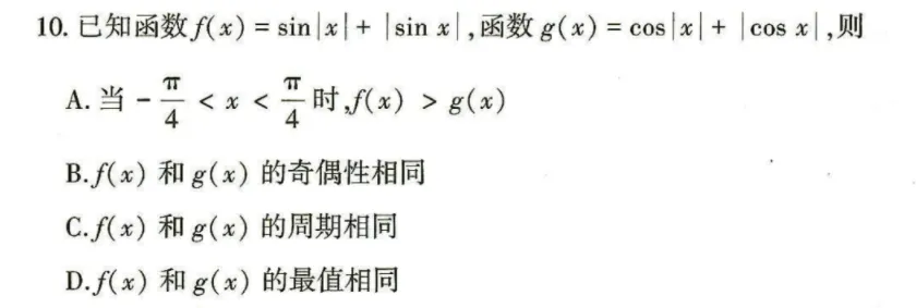 先来看选择题第10题。这道题给出了两个函数,f(x)=sin∣x∣+∣sinx∣ 和 g(x)=cos∣x∣+∣cosx∣,让你判断四个说法哪些正确。
