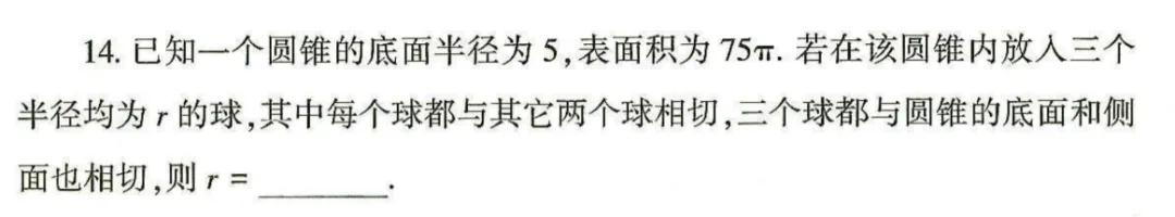 再看填空题第14题。说一个圆锥底面半径为5,表面积为75π。然后在这个圆锥内放入三个半径均为 r 的球,每个球都与其它两个球相切,三个球都与圆锥的底面和侧面相切,求 r。