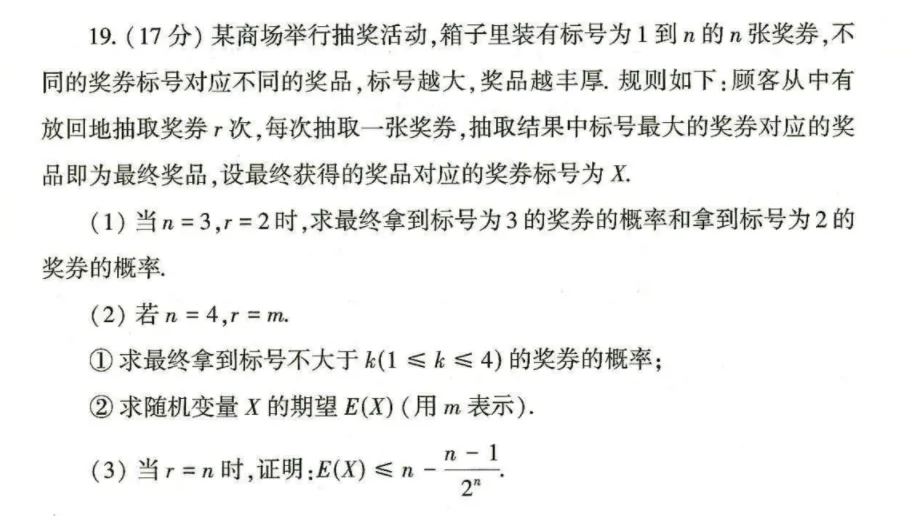 最后来看压轴题第19题。这道题讲的是商场抽奖——箱子里有标号为1到 n 的 n 张奖券,有放回地抽 r 次,取最大标号作为最终奖品。