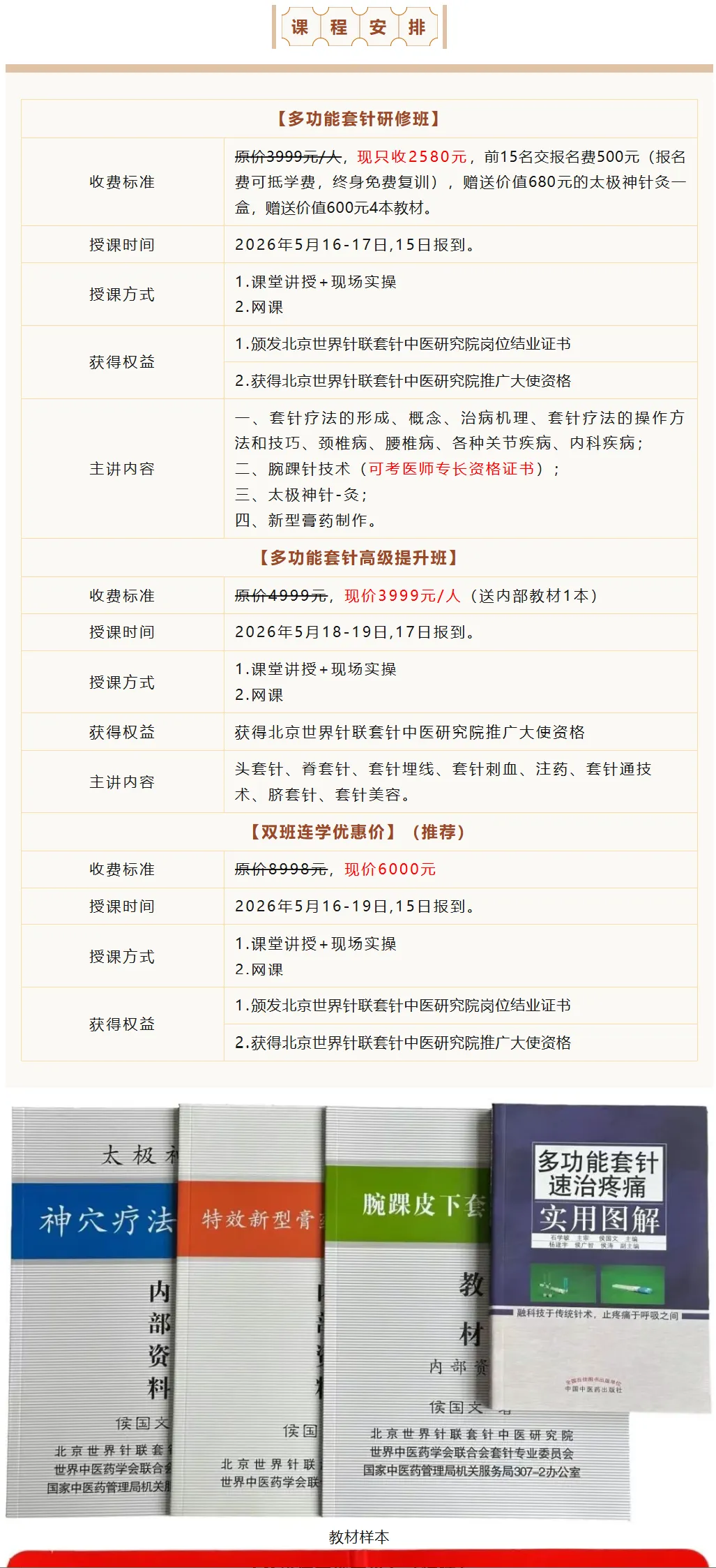 为贯彻落实国家中医药管理局关于推广中医药相关文件精神,做好中医药高新适宜技术成果项目推广、转化和实施工作,培养更多的中医药适宜技术人才,特举办腕踝针、多功能套针高级研修班。此项目获得中医药相关主管部门认可,被列入国家卫健委技术推广项目、国家中医药管理局传统医药国际交流中心高新适宜技术推广项目、国家科技部奖励办公室备案的科技进步奖、国家科技部奖励办公室备案发明奖、2023 年国家卫健委继续医学教育项目、2024年国家中医药管理局中医药继续教育项目、中国中医出版社教材、全国中医药行业高等教育“十四五”创新教材、世界多功能套针优秀技术创新奖。