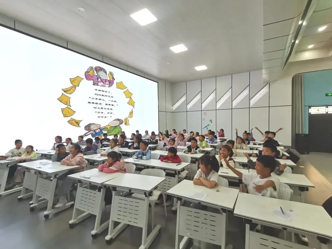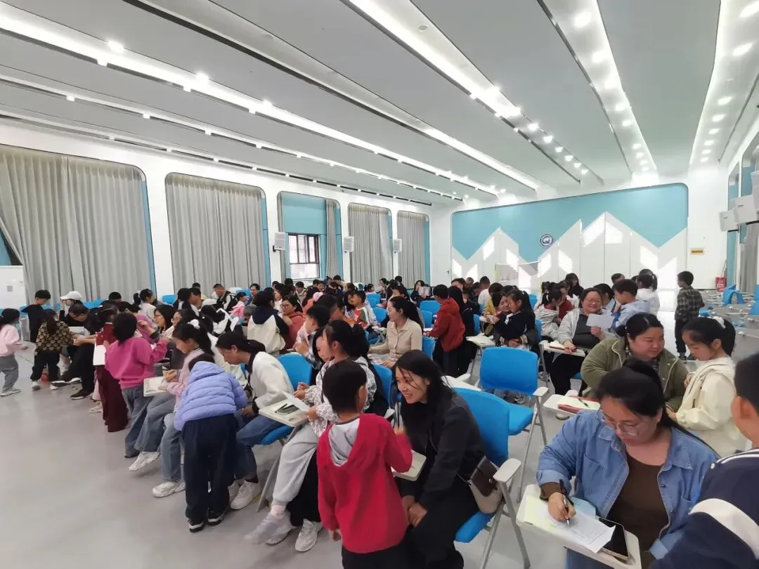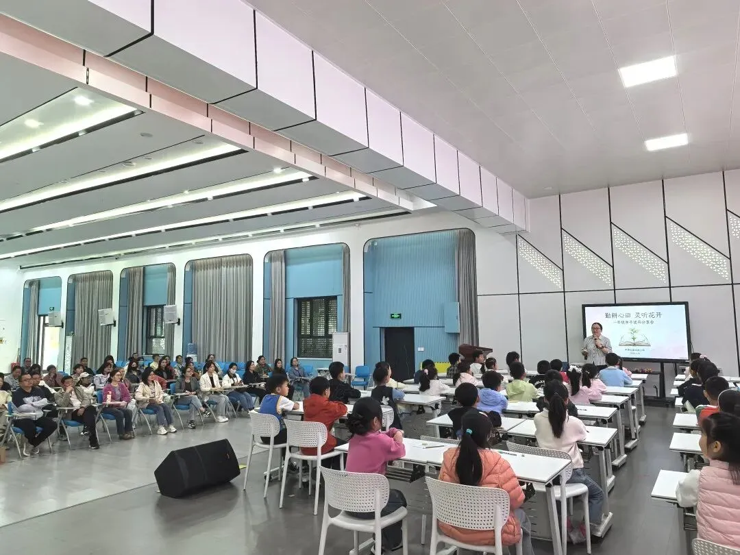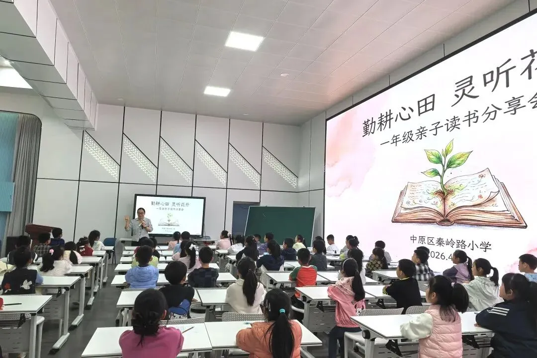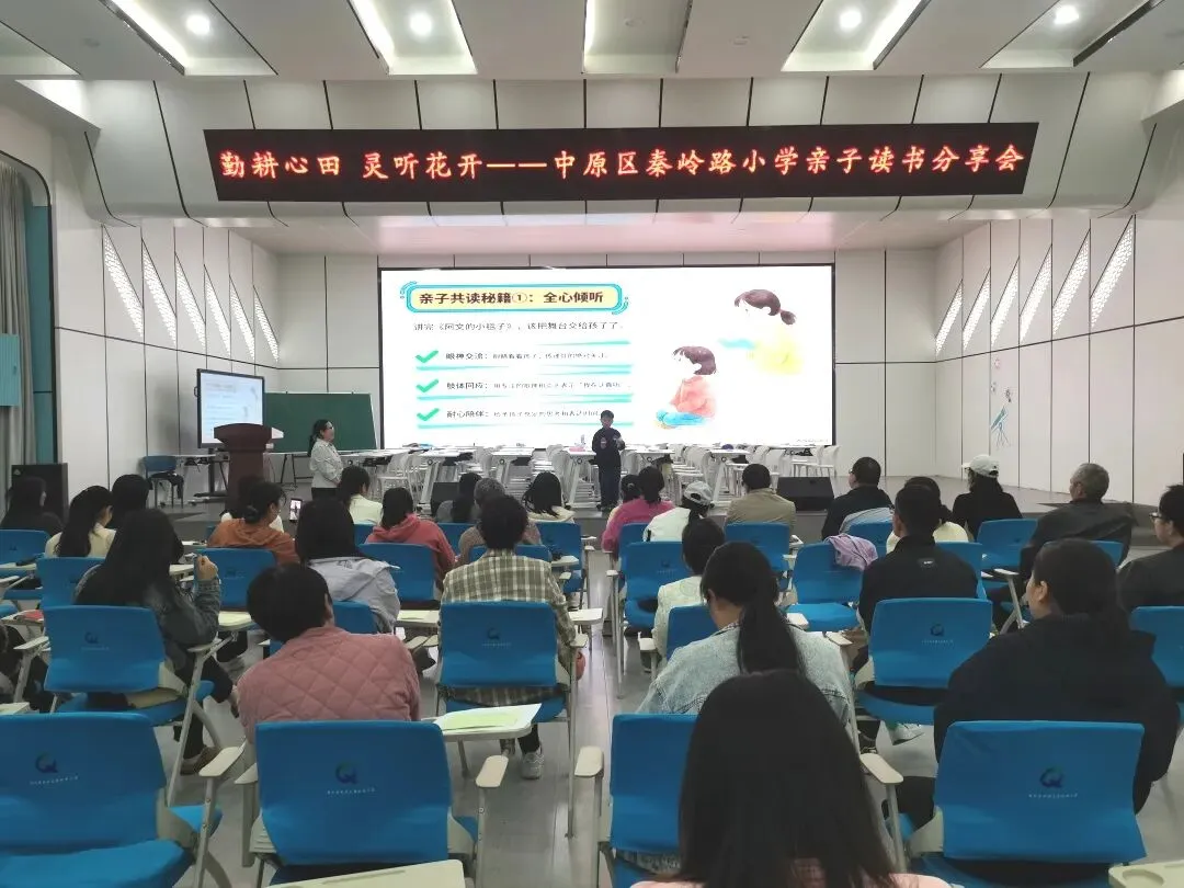 在世界读书日即将到来之际,在《全民阅读促进条例》正式公布之后,全民阅读的春风正吹进校园、吹进家庭。郑州市中原区秦岭路小学一直高度重视学生阅读素养和家庭阅读氛围的营造。4月22日下午,学校大礼堂里暖意融融,一场以“勤耕心田 灵听花开”为主题的亲子读书会正在举行。52名学生和他们的家长齐聚一堂,在张新玲老师的组织下,共同经历了一场关于成长、陪伴与阅读的温暖旅程。