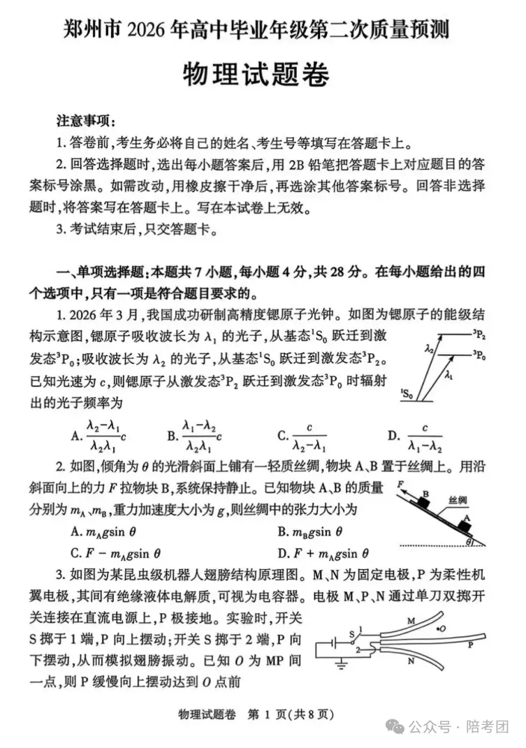 【陪考团】2026郑州高三二模物理试卷及答案.pdf