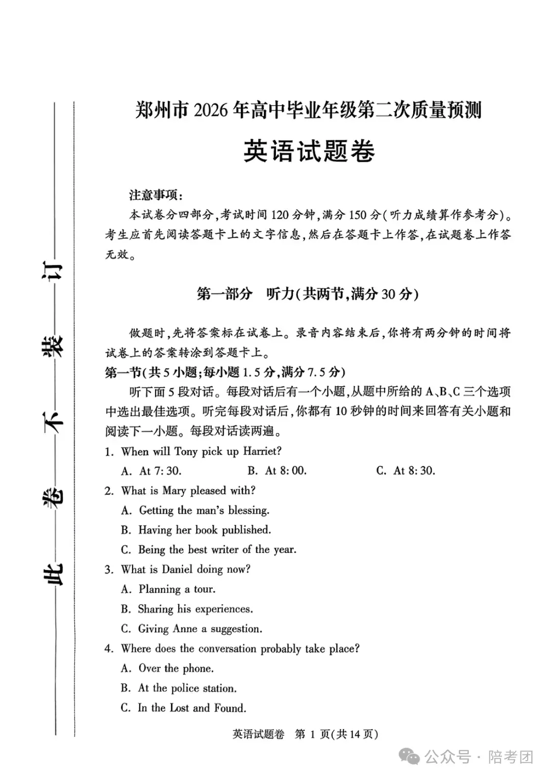 【陪考团】2026郑州高三二模英语试卷及答案.pdf