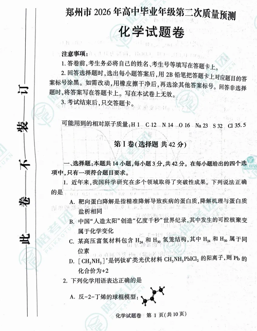 【陪考团】2026郑州高三二模化学试卷及答案.pdf