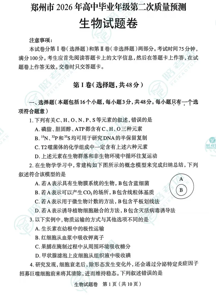 【陪考团】2026郑州二模生物试卷及答案.pdf