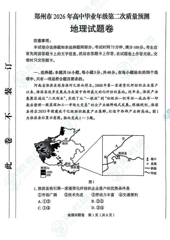 【陪考团】2026郑州二模地理试卷及答案.pdf