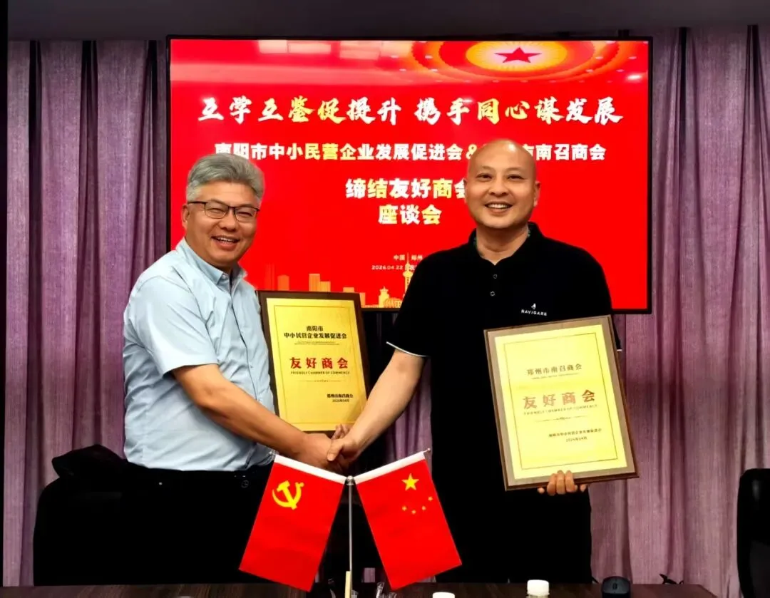 2026年4月22日,南阳市中小民营企业发展促进会(简称“南阳民促会”)代表团赴郑州,与郑州市南召商会举行深度交流座谈。双方以互学互鉴办会经验、务实对接赋能会员为主题,畅叙乡情、共商合作,并正式缔结友好商会合作关系,标志着两地商协会在跨区域联动、资源互通、服务企业等方面迈出实质性、标志性一步。南阳民促会由会长吴强带队,秘书长马定陕,副会长、融业企服负责人胡博,恒雪实业负责人赵鑫,至觉品牌设计负责人张延,闻风倒黄酒负责人韩哲,超欣鸡排负责人焦菊,梅先知识产权负责人陶梅先,会员薛毅委及秘书处成员参加交流。活动由郑州市南召商会执行会长赵万东主持,副会长、常务副秘书长柳建宇致欢迎词,两地商会核心班子及企业家代表共同座谈交流。柳建宇在致辞中,对南阳民促会一行到访表示热烈欢迎和诚挚问候。他表示,南阳历史厚重、人文荟萃,南阳民促会立足本土、深耕民营经济,平台规范、队伍精干、资源富集、作风务实,多年来在服务地方发展、赋能企业成长上成效显著,是值得认真学习借鉴的优秀兄弟商会。郑州市南召商会始终身在郑州、心系南阳、情牵南召,团结在郑乡贤企业家抱团发展、互助共赢,积极搭建政企沟通桥梁,精细服务会员企业,全力打造南阳在外企业家的“乡情港湾”与“发展平台”。前期两地商会已多次沟通对接,为本次互访交流、缔结友好打下坚实基础。他指出,这场相聚既是乡情之缘,更是力量汇聚。希望以友好商会缔结为新起点,双方实现乡情相融、资源相通、信息共享、优势互补,在商会建设上互学互鉴,在企业发展上互帮互助,共同服务好广大会员企业,共同打造高水平商会平台,为促进南阳、郑州两地经济联动发展、助力家乡高质量发展贡献商会力量与企业家担当。座谈中,郑州市南召商会会长郑润华详细介绍商会发展历程、运营体系及会员企业业态布局,系统阐释“一年搭框架、两年见实效、三年树标杆”的阶梯式发展规划,并就《郑州市南召商会2026年度工作计划(草案)》作专题汇报。郑润华介绍,商会以“召商同心,商召天下”为核心价值观,坚持党建引领统领全局,构建商会、党支部、驻郑人才工作站、驻中部地区招商联络处四位一体运营模式,全方位服务会员发展与家乡建设。2026年,商会将围绕夯实基础工作、实施企业赋能、打造特色活动、完善组织架构、强化落地保障五大方向发力,不断提升服务质效、增强商会凝聚力,其规范化建设与精细化运营经验,给南阳民促会一行留下深刻印象。执行会长赵万东在交流中凝练南召企业家精神:南召人聪明、兼具憨厚务实、敢闯敢干、吃苦耐劳的鲜明特质。商会自2006年南召驻郑党总支红色传承起步,2023年正式成立,始终坚持党建引领守方向、团结聚力树形象、奉献担当促发展、创新赋能强会员,未来将持续完善青年联合会、乡镇分会、妇委会、体育健康部等组织架构,不断拓宽服务覆盖面。南阳民促会秘书长马定陕介绍协会发展历程、组织架构与核心服务职能。协会由市工商联主导,依托南阳民营服务云平台,以整合资源、优化环境、服务民营企业为宗旨,探索“基金会+市场化公司”反哺商会的可持续运营模式,常态化开展主题讲堂、“四进四送”、读书会等特色活动,积极拓展异地商会合作,甚至与巴基斯坦大使馆建立友好联系,取得一系列务实成果。未来,协会将持续壮大会员队伍、优化服务机制、推进县区分会建设、强化品牌IP打造,更好赋能南阳民营企业成长。交流现场,南阳民促会企业家代表结合自身实践,分享商会赋能、企业借力平台发展的实战经验与深刻感悟,观点鲜明、干货满满,为商会运营与企业发展提供了可复制、可推广的实践路径。张延:商会品牌化,品牌节日化,以大事件驱动企业升级至觉品牌设计负责人张延围绕品牌运营赋能作专题分享,提出“商会走品牌化之路,品牌实现节日化落地”的核心理念。她结合实战案例表示,通过策划标志性行业活动、打造品牌IP事件,能够有效提升商会影响力与会员企业曝光度,助力企业在转型关键期破局突围、实现高质量发展。胡博:平台成就个人,抱团放大势能,构建全链条赋能闭环融业企服负责人胡博结合两年入会成长经历,分享了一系列直击本质的观点:-“单打独斗的时代已经过去,组织的力量、平台的力量、生态的力量,远大于个人力量”;-“你重视协会,协会才会重视你;你托起平台,平台才会托起你”;- “商业合作的底层是信任,先认识、再认知、再认可,最后自然有认购”。他提出,协会对会员的核心价值,在于形成提升认知、链接人脉、建立信任、抱团取暖、放大势能的完整赋能闭环。在“势能即流量”的当下,商会要实现长效发展,必须做到有人干事、有机制立信、有路径转化,通过高频次活动与深度链接,实现资源对接与价值变现。加入民促会以来,他不仅实现个人与企业快速成长,更依托平台为多家会员企业解决融资难题,以专业能力反哺协会、服务同仁。恒雪实业负责人赵鑫分享短视频矩阵运营经验,在协会氛围带动下坚持运营数十个账号并形成可复制案例;闻风倒黄酒负责人韩哲借助商会年会等重大活动,以品牌赞助实现企业IP与个人IP同步提升,推动产品推广与企业转型升级,生动展现了商会平台对企业发展的强大助推作用。自由交流环节,双方围绕商会日常管理