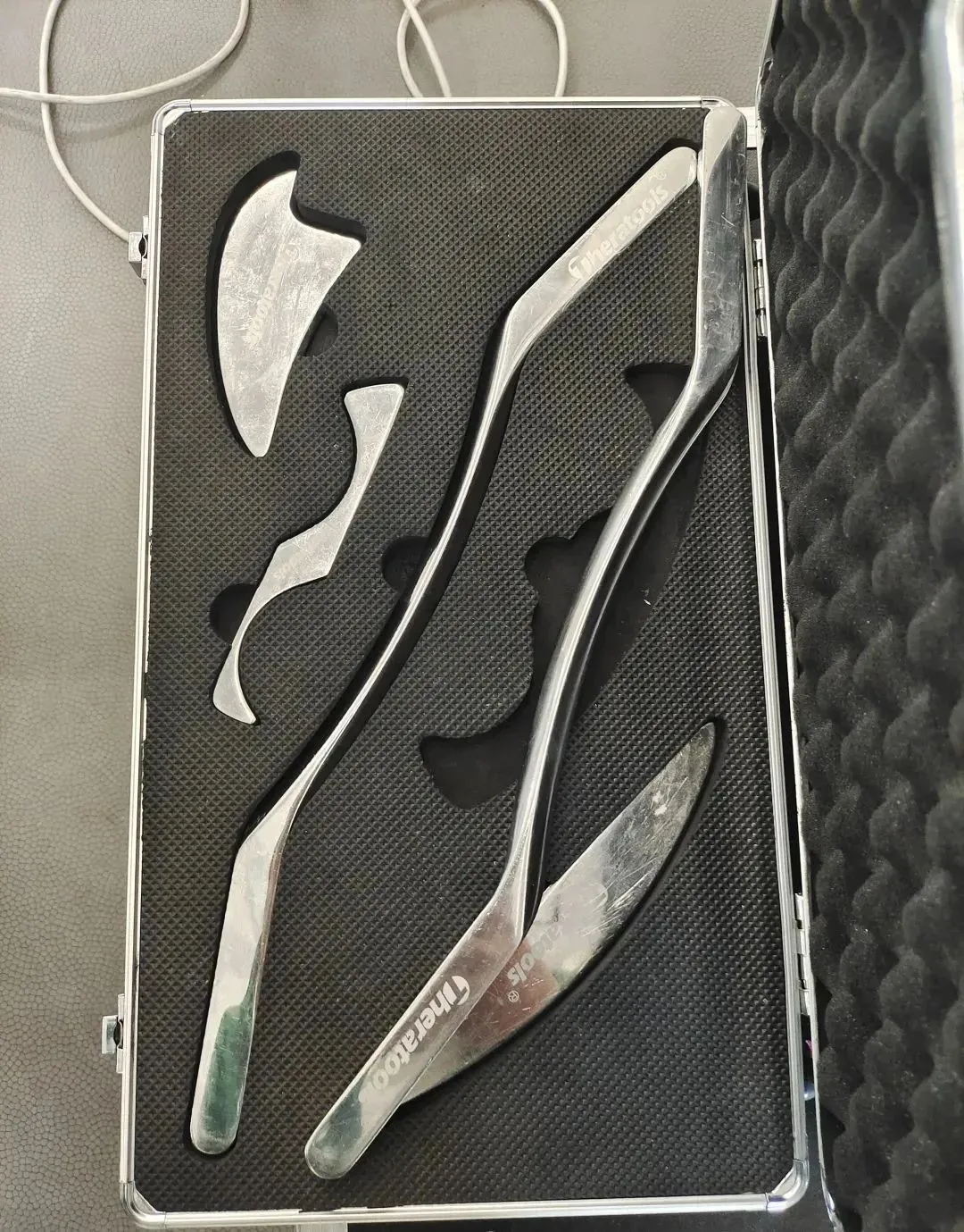 筋膜刀并不是真正的刀,而是医疗用的软组织松解用具。它是一种从中医刮痧演变而来的现代改革技术,刮痧刮的是皮肤,出痧是毛细血管破裂的青紫斑,而筋膜刀的靶器官是筋膜层,浅筋膜即皮下至肌肉。筋膜刀技术以四维视角看待人体疾病,通过对结缔组织进行特定的应力刺激,平衡人体宏观生物力学,影响微观力学环境,促进损伤组织与器官的细胞再生、修复、重塑,加速人体自愈。钩子刀又称作 S 型刀。常用于定点松解,适用于胸锁乳突肌等条索状筋膜;鲨鱼刀又称作 A 型刀。常用来清除路障,特殊角度可处理指关节;探扫刀又称作 C 型刀。用于探测筋膜问题的方向和深度,找出结节点以及张力过大部位;蝙蝠刀又称作 B 型刀。中间为髌韧带专用,两侧弧度用来处理人体前臂筋膜松解;大 M 刀又称 M 型刀。用来处理大肌群,比如背阔肌、斜方肌、大腿后侧等大肌群。