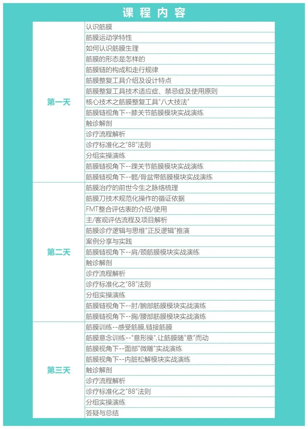 ·技术实战派:各肌筋膜单元触诊解剖、诊疗流程解析、案例展示及治疗逻辑推演、诊疗操作标准化规范化建立;适合人体的大部分区域及经典痛症,治疗手法好学且多样;课程内容紧贴市场需求、提炼实用筋膜刀技能,学完即上手、创造价值